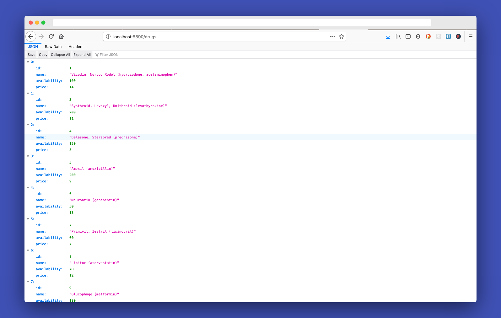 Now visit localhost:8890 and you should see the list of drugs being returned.