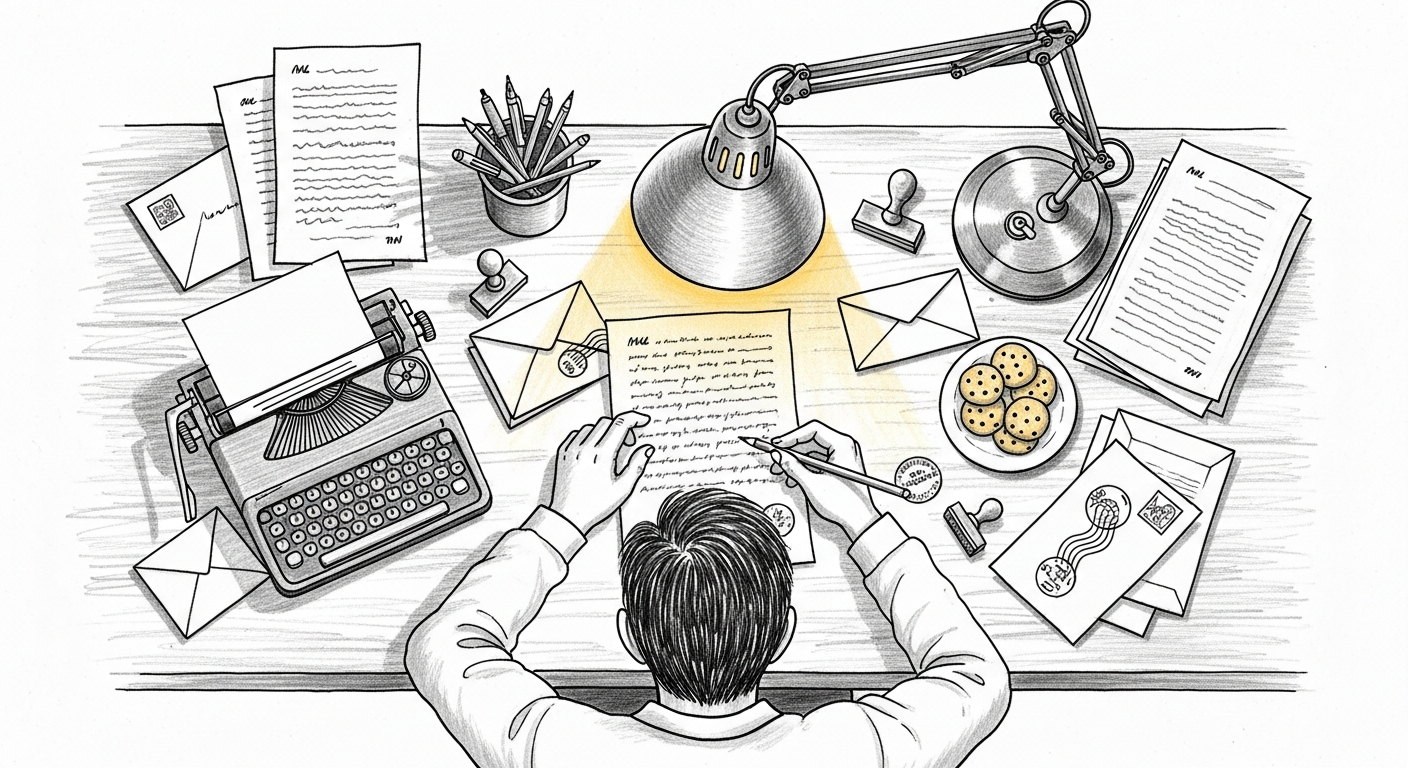 Illustration of a man writing on a desk. A lamp is glowing, everything is black and white except the light and cookies, generated by Google Imagen 4