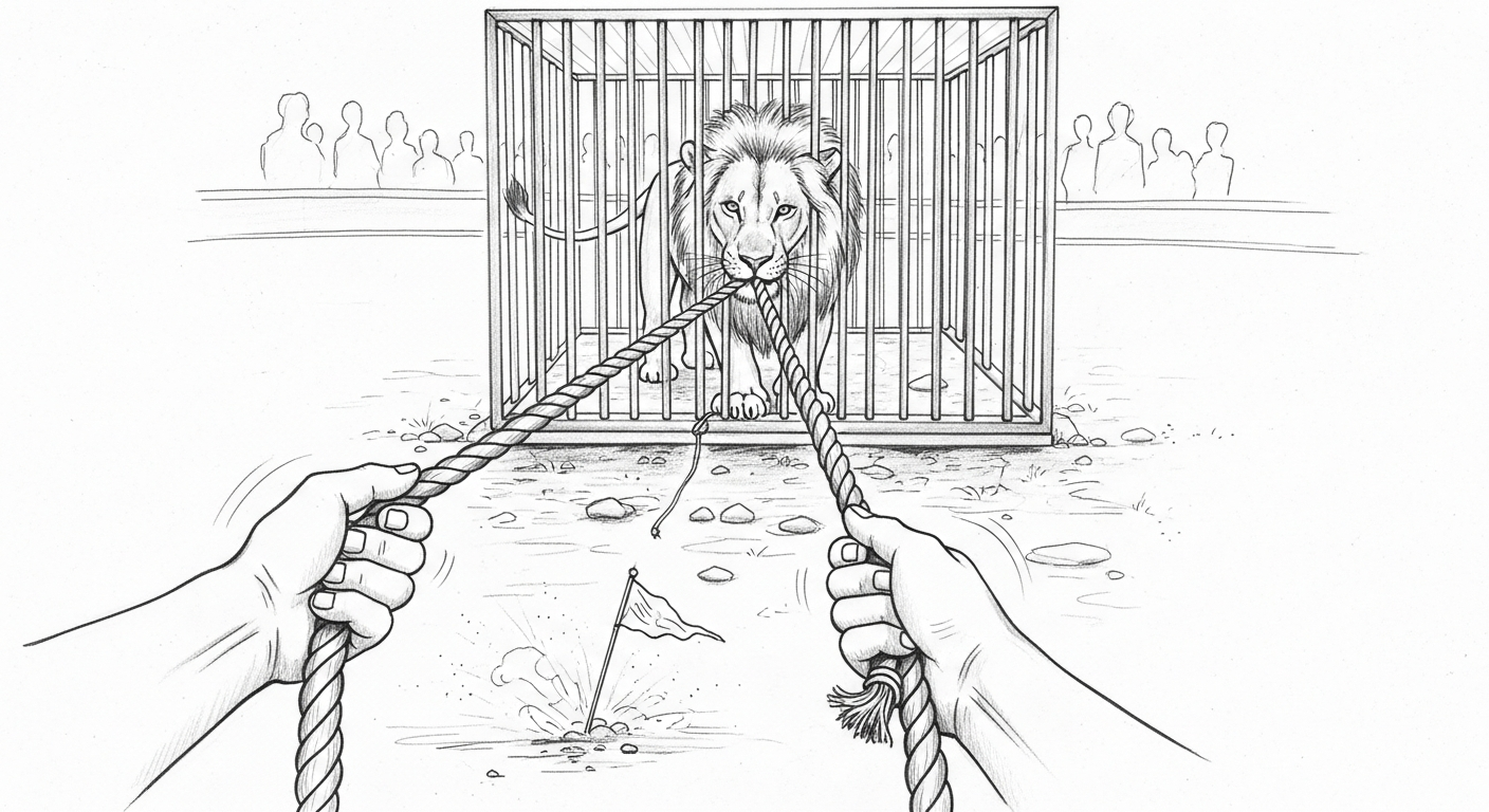 Illustration of a man playing tug of war with a lion in captivity, generated by Google Imagen 4